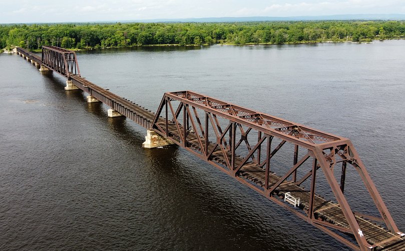 At this MP the Beachburg Sub crossed from Ontario to Quebec over the Ottawa River on a 485 m multi-span bridge. Of the twelve spans, ten are deck plate girder spans with an average length of 34 m. The other two are truss spans of 61 m and 89 m. I guess the truss spans are over deeper channels (making it harder to place piers with the same spacing), and the higher clearance perhaps better allows for boat traffic.