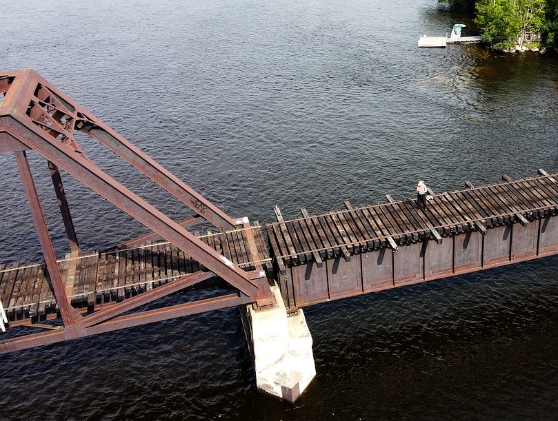 I parked at the end of Morris Island Dr., as the end of Loggers Way has “No Trespassing” signs between the end of the road and the railway right-of-way. There was a well-worn path through the woods to the right-of-way. The Google Earth imagery lead me to believe that the bridge would be blocked off, but in fact there were just some mounds of dirt and concrete blocks which one can easily walk over/around. For some reason I decided it would be advantageous to go out onto the bridge just short of the first truss span to get my aerial shots. In retrospect, it would have been easier to stay on shore!